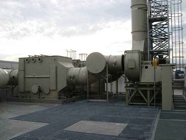 上圖中黑色的風(fēng)機為防爆型玻璃鋼離心風(fēng)機,廢氣處理塔的材質(zhì)選擇的是pp材料,管道則使用的是碳鋼材料。